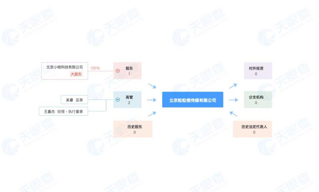 北京粒粒橙传媒有限公司由北京小桔科技有限公司全资控股,法定代表为滴滴市场部负责人王嘉杰,经营范围包含电视剧制造、音像制品制造、电子出版物制造、电影发行等。
